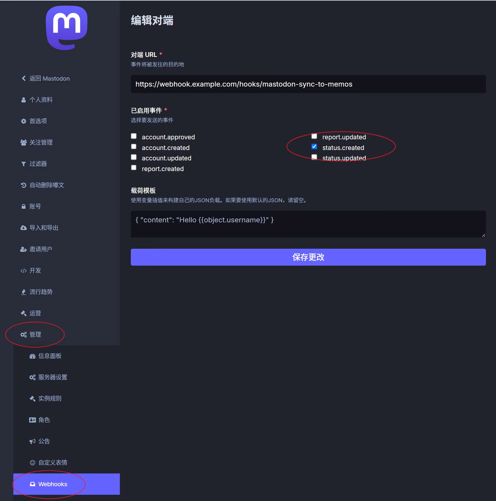 Mastodon 前往 https://{INSTANCE}/admin/webhooks